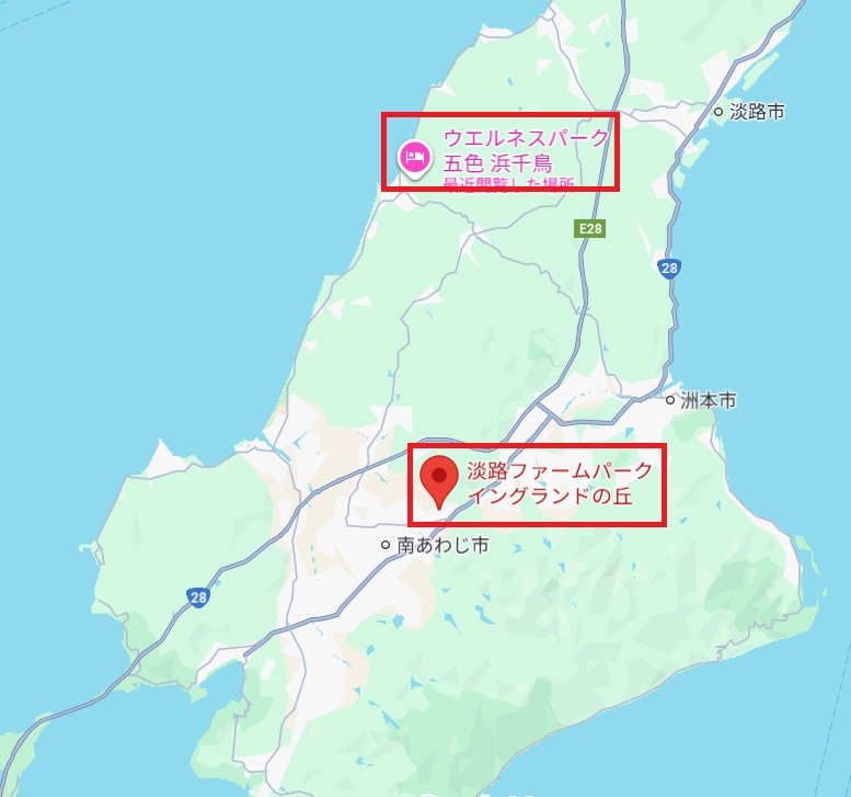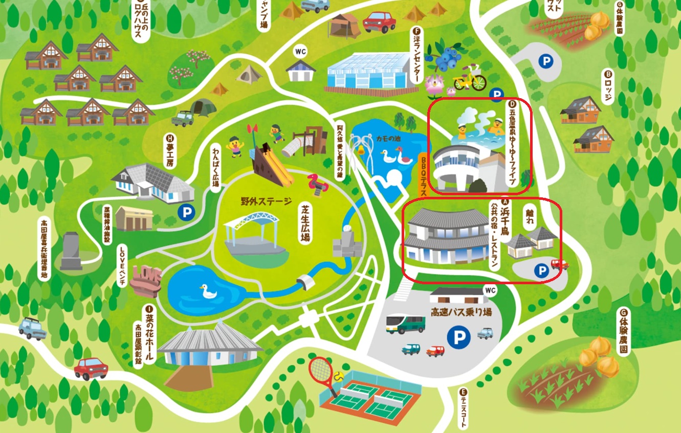 ウェルネスパーク絵地図の下の赤線内「離れ」と「浜千鳥」の本館に分かれて宿泊。上の赤線内温泉施設で入浴。