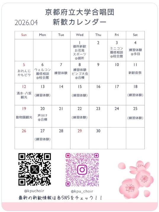 合唱団のエックスには4月から始まる新歓のカレンダーも発表されています