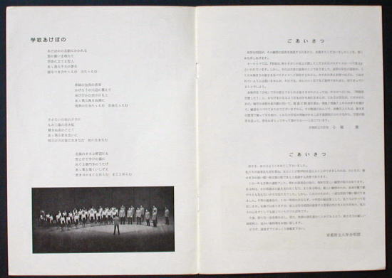 ◆会場は勤労会館で、記念の合同演奏はシューマン「流浪の民」とヘンデル「ハレルヤ・コーラス」でした。5ステージの真ん中の3ステージ目が合同演奏で、指揮は卒業して2年経っている日浦さんが振っておられます(伴奏は後に日浦夫人となる小山由美子さん)。日浦さんとは別に客演指揮者はOBのW12土田和彦さんで、2ステージ目に清水脩「日本民謡集」と5ステージ目に組曲「水のいのち」を振っておられます。 |