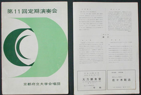 ◆1968年第11回定演の表紙写真と、最終ページ(合唱団プロフィル、団員名簿)より1ページ前のページの写真です。小さくて読めませんでしょうが、このページにはパート紹介が出ています。そうです、この11回定演プログラムで始めてパート紹介のページが出来たのです!! 前回の第10回定演プログラムで「団のプロフィール」のことを紹介しましたが、これは第5回定演から始まったものです。そしてここにパート紹介のページが出来、それが後に発展してパートごとのメンバー紹介の定番ページとなるのです。ちなみにプログラムの中でこのページだけは当初からユーモラスな内容となっています。