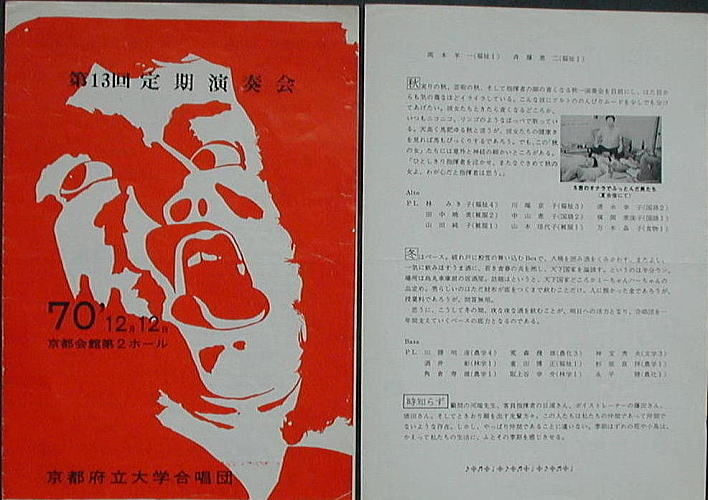 ◆未発掘の第12回定演プログラムのことは分かりませんが、現存する史料ではこの第13回定演プログラムで初めて、パート紹介のページに写真が使われます。それは写真右のものです。小さくて見えませんが写真の解説には「S君のオナラでふっとんだ男たち(夏合宿にて)」とあり、苦しい団運営にも関わらず、気楽なパート紹介ページでありました。それまでのプログラムに載る写真は、ステージにズラッと並んで歌っている団写真のみでした。