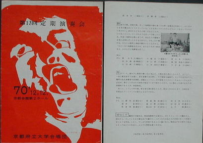 ◆この非常にインパクトのある絵は当時1回生で、その後2・3回生の時に連続して幹事長となられた重田氏の描いたものです。なぜ団員の絵が表紙を飾るようになったのか、当時の方々にうかがっても古いことで判明しませんでした。とにかくこれ以降10年足らずの間、定演プログラムはわが団独特のものを作り出し続けるのでした。このことは後の連載で明らかになります。