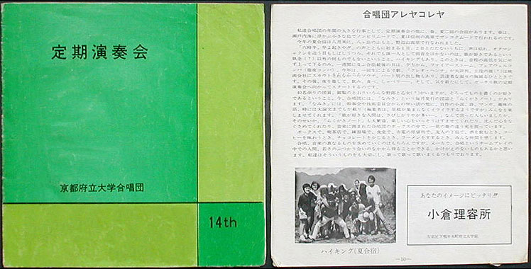 ◆1971年第14回定演は京都会館第二ホールで開催され、そのプログラムは再び7〜9回定演のものと同様小型のサイズとなっています。左の方の写真が演奏会の表紙です。右の方の写真は団紹介のページに掲載された野辺山高原夏合宿でのハイキングの写真です。 ◆この年は二年前の新勧失敗がたたって、3回生が殆どおらず、団役員で正指揮者のみが4回生の夏木氏で、後は幹事長の重田氏、副指揮者の角倉氏をはじめ全員が2回生でした。 ◆この定演では最終の4ステージが日浦さん指揮のモーツァルト「戴冠ミサ曲」でオーケストラ伴奏付となってます。オケは京都市立芸大の学生有志で構成されたものでしたが、この当時に大学合唱団でオケをつけることは稀でした。 ◆世の動き…円変動相場制に移行、環境庁発足、岩手県雫石で全日空機と自衛隊機衝突、連続女性殺害の大久保清事件、マクドナルド上陸、アンノン族、Tシャツ・Gパン、中国が国連へ、LPレコード1枚千円の廉価盤ブーム、洋画『ある愛の詩』