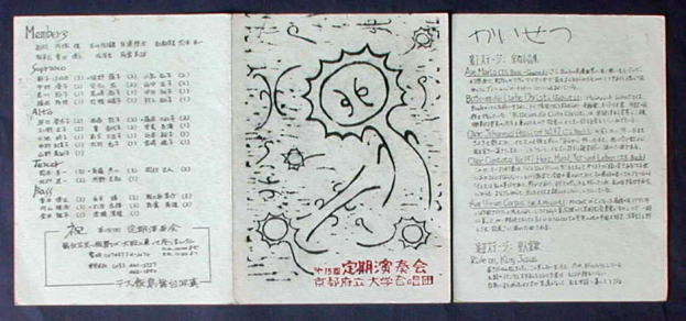 ◆プログラムの宣伝欄は写真の左下にある「テス飯島舞台写真」のみであった。この前回、第14回定演のプログラムでは「煖」「質ムカデヤ」「河合昇酒店」「松びし食堂」「純喫茶ドリアン」「永平酒店」「こうず食堂」「力餅食堂」「京都府婦人センター」など18件あったものがたった1件になっている。これは手作り印刷でプログラム代費用が大幅に減ったためであろう。