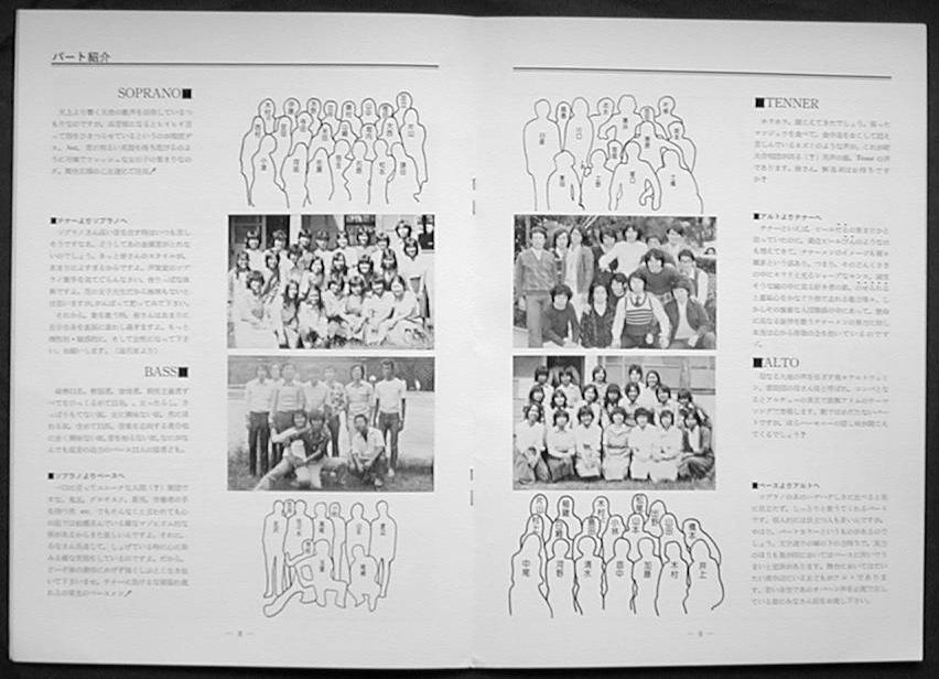 写真は20回定演プログラムの各パート紹介のページです。左上がソプラノ。「テナーよりソプラノへ」…ソプラノさん高い音を出す時はいつも苦しそうですなあ。どうしてあの金属音が取れないのでしょう。きっと皆さんのスタイルがあまりによすぎるからですよ。声楽家のソプラノ歌手を見てごらんなさい、皆立派な体格ですよ。がんばって肥ってみてください。