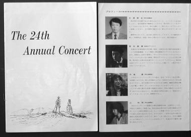 ◆1981年第24回定演プログラムの表紙(左側)とプロフィールのページ写真です。プロフィール写真は上から真面目に写りすぎた日浦氏、二段目が客演ピアニストの坂田誠康氏、三段目が学生指揮者の河端康氏。四段目が学生指揮者の辻和明氏で、その彼の紹介文は「本日のコンサートの幕開けを飾る指揮者が彼です。大胆さと同時に体重○kg、身長180cmという大柄な体格からは、ちょっと想像できないようなナイーブな面をも持ち合わせており、そのためか、1回生の女声の間で圧倒的な支持を得ているそうです」。 ◆1ステが辻氏指揮のアメリカ民謡「I’ve