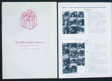 Vous”とフランス語で「あなたへのクリスマスプレゼント」と書いてあります。シンプルですが温かみのある表紙となってます。 ◆1ステが正指揮者角田直弘氏指揮の武満徹作曲「混声合唱のための『うた』」より「島へ」「小さな空」「○と△の歌」「さようなら」「死んだ男の残したものは」の5曲。2ステが日浦氏指揮で佐藤真作曲の組曲「旅」。3ステがPOPで、「トロピカルアイランド」と題して曲は…SIESTA・海はまねくよ・セイリング・サモア島の旅・アイアイ・ココナッツとバナナ・コパカバーナ・魅惑の宵。4ステは日浦氏指揮のプーランク「モテット」。 ◆写真の右側はパート紹介のページの写真で、それぞれの団員の顔写真が一人一枚ずつ並べられています。小さくて見にくいですが、上段Sopで下段がAltで、みんなそれぞれに明るい笑顔で、見ているほうがなんとなく暖かい心持になります。といっても下記の通りこの年の団は色々と苦しい時期だったのです。 ◆この年は副指揮者がジョイント終了後に中途退団して、そのため日浦さんが宗教曲のほかにも2ステ目も振ることになりました。団員数も団史上最少の33名となり、テナーは4名のみでした。合唱団の苦しい時期の定演だったのです。そして翌年は団存亡の危機を迎えます。 ◆世の動き…群馬県御巣鷹山に日航機墜落520人死亡、阪神優勝で虎フィーバーの社会現象に、写真雑誌F・F戦争、ソ連チェルネンコ死去でゴルバチョフが書記長に、バッハ・ヘンデル生誕300年記念の年、邦画『乱』 《言葉》おニャン子、新人類、イッキイッキ!、パフォーマンス、ハナキン、分衆、ネバカ、トラキチ 《府大では》文学部に史学科を設置(定員10名)。大学会館新築工事が竣工