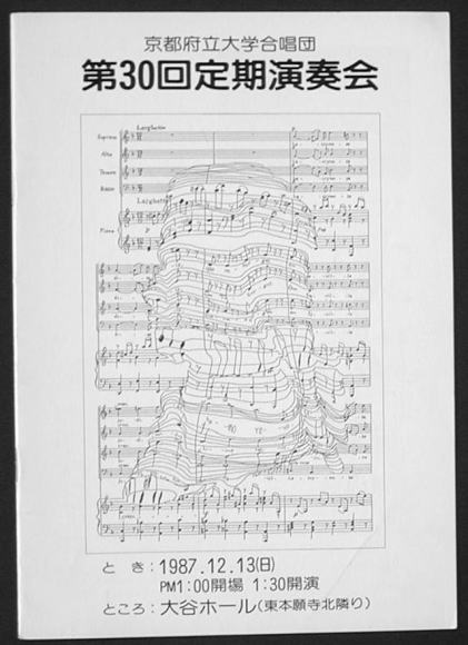 ◆1987年第30回定演プログラム表紙ですが、なかなか凝っています。楽譜は手書きのもので、それがモーツァルトの横顔に見えるように歪められて描かれています。パソコンで処理したのではなく、どうも手書きで出来ているようで、自分たちの手でやったとしたら、非常に大したものです。よく出来た表紙です。ちなみにこの年はテナー人数は8人になっていました。まずは安泰。 ◆全3ステージで、1ステが長崎徹氏指揮で萩原英彦作曲の組曲「動物たちのコラール」…小さいあひるの祈り・ちょうの祈り・のみの祈り・小鳥の祈り・ガゼルの祈り。2ステが田辺真視氏指揮のPOP「ある夜、駅は…」星に願いを・Canon・TAKING