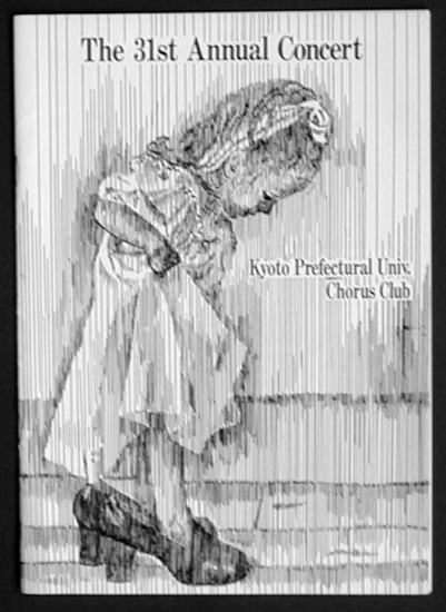 ◆1988年第31回定演プログラムの表紙。表紙の幼女の絵は演奏曲目と関係なさそうです。演奏会のあった12月は昭和天皇病状悪化で、日本社会は表向きあまり派手なことは出来ない雰囲気にありました。といっても我が団の定演プログラムにそのようなことが反映されたわけでもないでしょう。 ◆1ステは3回生田辺真視氏指揮の池辺晋一郎作曲の混声合唱による童話「淋しいおさかな」、童話ですからやたら歌詞が長いです。2ステは小林卓司氏指揮で多田武彦作曲の組曲「季節のたより」…冬のもてこし・松径・七月は鉄砲百合・祖母・虫くひ寺・蟋蟀・剥啄・こんこんこな雪ふる朝に。これらの曲のうち「松径」と「蟋蟀」とは愛唱歌集に収録されました。 ◆3ステはPOPで題して「祭」で、エレクトーンやギター伴奏で…村祭・OB-LA-DI,OB-LA-DA・光のカーニバル・お祭りマンボ・HAPPY