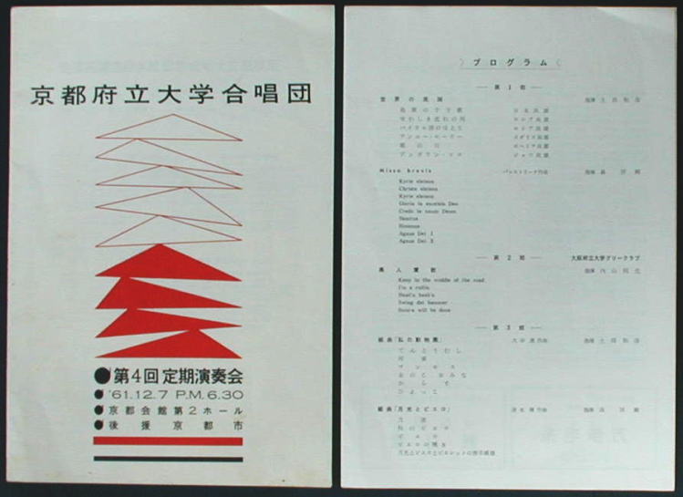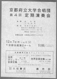 さて今回は1961年の第4回定演のチラシが残っておりましたのでそれを載せます。サイズはB5の更に半分B6です。紙の質は薄いのでたくさん刷って、第1回演奏会の時と同様に他の音楽会などの折に会場前で団員によって配られていたと思われます。写りが少し不鮮明かもしれませんが、ご勘弁を。
