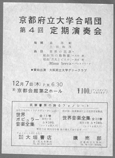 ◆入場料が100円です。ちなみに会場は第3回までは府立医大ホールでしたが、この年は前年開館したての京都会館第二ホールを使っています。入場料の横に小さく「プレイガイドにあります」と記載されております。この当時からすでに「プレイガイド」という言葉が使われていたんだと驚きつつ、この頃に一般のプレイガイドにチケットを置くなんてスゴイなぁと思いました。
