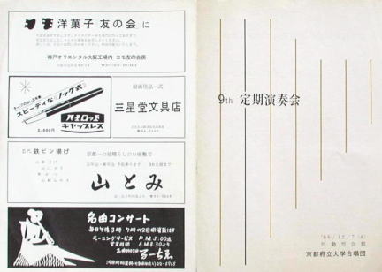 ◆1966年第9回定演プログラム。この年に開館したての府立勤労会館での演奏会。勤労会館はかつては烏丸丸太町下る東側にあって、今はなくなっています。